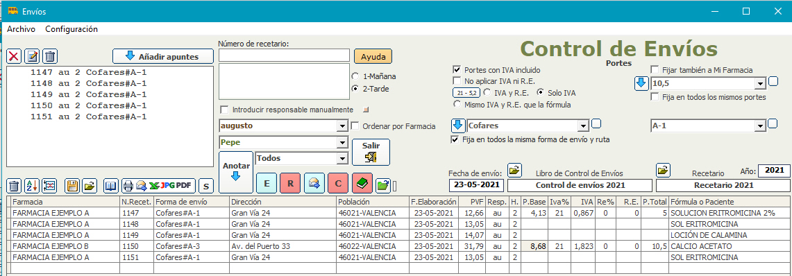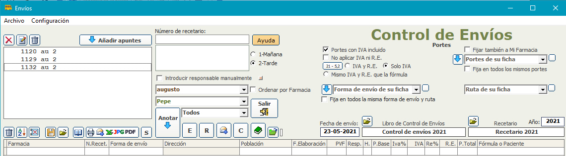 puede cambiar el recetario y el Libro de Control de Envíos.